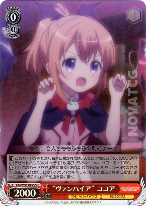 【自】 このカードが手札から舞台に置かれた時、あなたは他の自分の、《BLOOM》か《ラビットハウス》のキャラを1枚選び、そのターン中、パワーを+1000。
