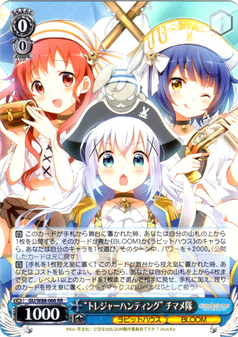【自】 このカードが手札から舞台に置かれた時、あなたは自分の山札の上から1枚を公開する。そのカードが青か《BLOOM》か《ラビットハウス》のキャラなら、あなたは自分のキャラを1枚選び、そのターン中、パワーを+2000。(公開したカードは元に戻す)