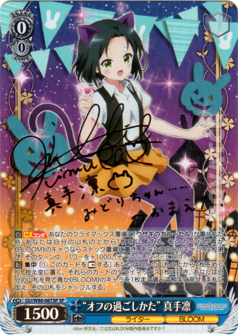 【自】【CXコンボ】 あなたのクライマックス置場に「ウサギのカルーセル」が置かれた時、あなたは自分の山札の上から1枚を公開する。そのカードが青か《BLOOM》のキャラならストック置場に置き、あなたは自分のキャラを1枚選び、そのターン中、パワーを+1000。(そうでないなら元に戻す)