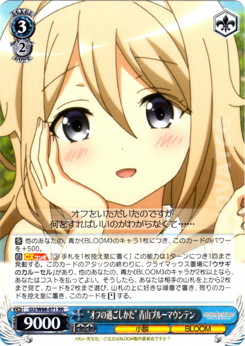 [A] – CX COMBO [(3) Place one Card from Hand into Waiting Room] This effect activates up to one time per turn, at the end of this card’s attack, if you have [ウサギのカルーセル] in your Climax Zone, if you have two or more other Blue or《BLOOM》Characters, you may pay the cost. If you did, look at two cards from the top of your opponent’s Deck, choose up to two cards, place it on top of their Deck in any order, place the remaining cards into Waiting Room, STAND this Card.