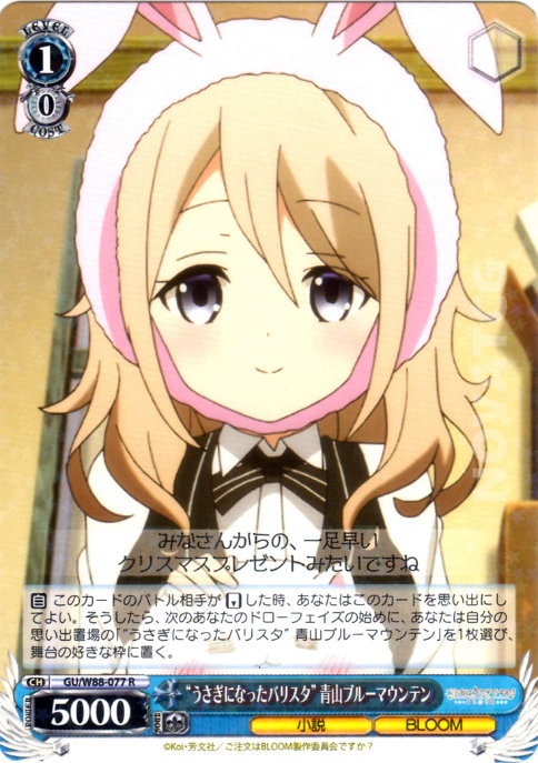 【自】 このカードのバトル相手が【リバース】した時、あなたはこのカードを思い出にしてよい。そうしたら、次のあなたのドローフェイズの始めに、あなたは自分の思い出置場の「“うさぎになったバリスタ” 青山ブルーマウンテン」を1枚選び、舞台の好きな枠に置く。