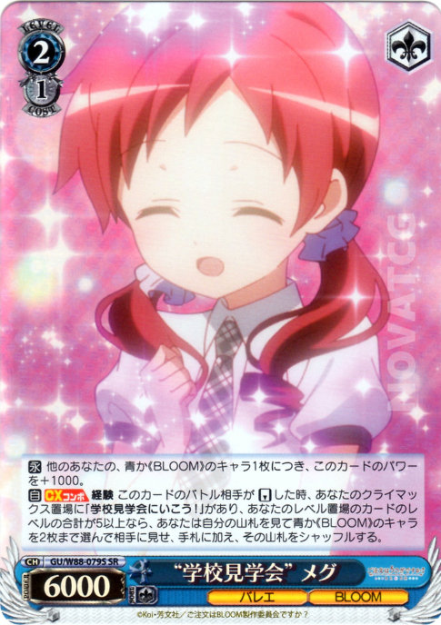 【自】【CXコンボ】 経験 このカードのバトル相手が【リバース】した時、あなたのクライマックス置場に「学校見学会にいこう!」があり、あなたのレベル置場のカードのレベルの合計が5以上なら、あなたは自分の山札を見て青か《BLOOM》のキャラを2枚まで選んで相手に見せ、手札に加え、その山札をシャッフルする。