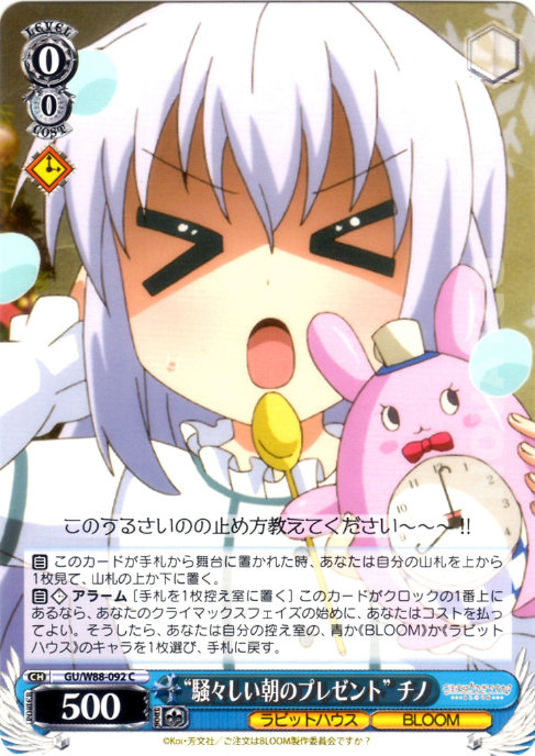 【自】【クロック】 アラーム [手札を1枚控え室に置く] このカードがクロックの1番上にあるなら、あなたのクライマックスフェイズの始めに、あなたはコストを払ってよい。そうしたら、あなたは自分の控え室の、青か《BLOOM》か《ラビットハウス》のキャラを1枚選び、手札に戻す。