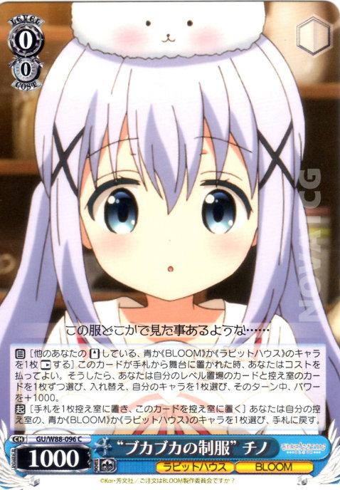 【起】[手札を1枚控え室に置き、このカードを控え室に置く] あなたは自分の控え室の、青か《BLOOM》か《ラビットハウス》のキャラを1枚選び、手札に戻す。