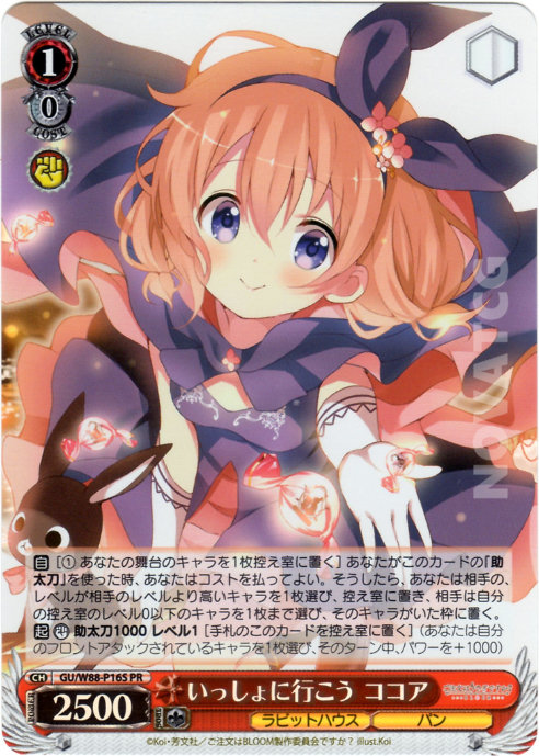 【起】【カウンター】 助太刀1000 レベル1 [手札のこのカードを控え室に置く] (あなたは自分のフロントアタックされているキャラを1枚選び、そのターン中、パワーを+1000)