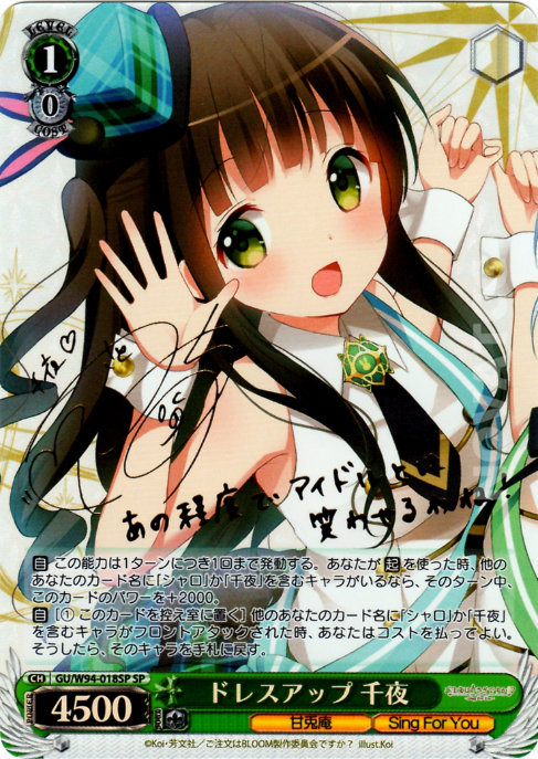 【自】 この能力は1ターンにつき1回まで発動する。あなたが【起】を使った時、他のあなたのカード名に「シャロ」か「千夜」を含むキャラがいるなら、そのターン中、このカードのパワーを+2000。