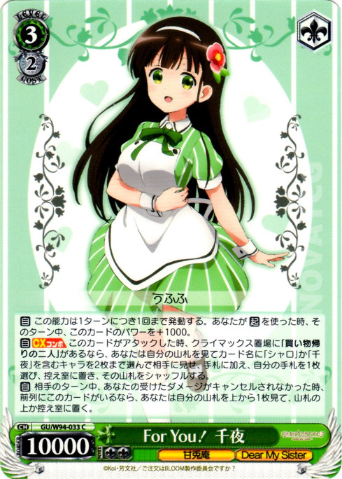 【自】【CXコンボ】 このカードがアタックした時、クライマックス置場に「買い物帰りの二人」があるなら、あなたは自分の山札を見てカード名に「シャロ」か「千夜」を含むキャラを2枚まで選んで相手に見せ、手札に加え、自分の手札を1枚選び、控え室に置き、その山札をシャッフルする。
