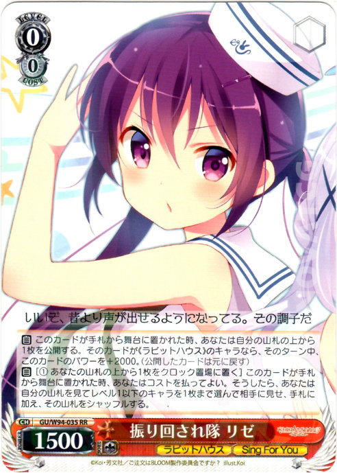 【自】 このカードが手札から舞台に置かれた時、あなたは自分の山札の上から1枚を公開する。そのカードが《ラビットハウス》のキャラなら、そのターン中、このカードのパワーを+2000。(公開したカードは元に戻す)