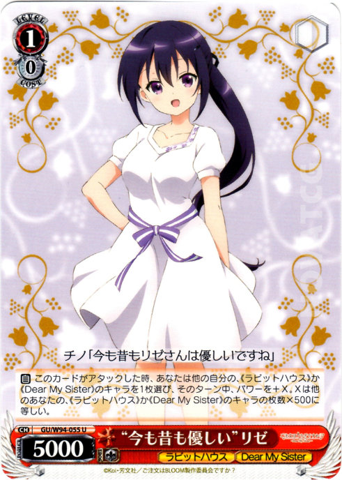 【自】 このカードがアタックした時、あなたは他の自分の、《ラビットハウス》か《Dear My Sister》のキャラを1枚選び、そのターン中、パワーを+X。Xは他のあなたの、《ラビットハウス》か《Dear My Sister》のキャラの枚数×500に等しい。
