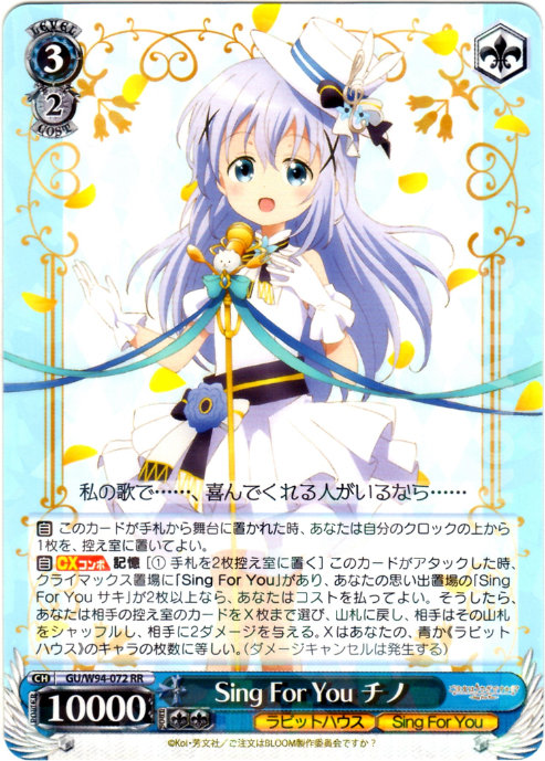 【自】【CXコンボ】 記憶 [(1) 手札を2枚控え室に置く] このカードがアタックした時、クライマックス置場に「Sing For You」があり、あなたの思い出置場の「Sing For You サキ」が2枚以上なら、あなたはコストを払ってよい。そうしたら、あなたは相手の控え室のカードをX枚まで選び、山札に戻し、相手はその山札をシャッフルし、相手に2ダメージを与える。Xはあなたの、青か《ラビットハウス》のキャラの枚数に等しい。(ダメージキャンセルは発生する)