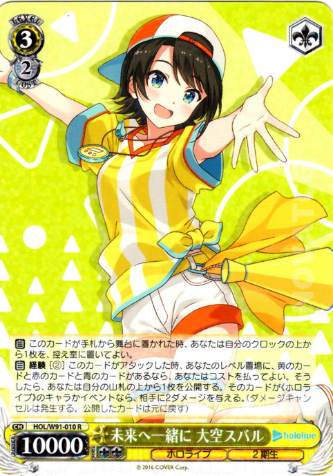 【自】 経験 [(2)] このカードがアタックした時、あなたのレベル置場に、黄のカードと赤のカードと青のカードがあるなら、あなたはコストを払ってよい。そうしたら、あなたは自分の山札の上から1枚を公開する。そのカードが《ホロライブ》のキャラかイベントなら、相手に2ダメージを与える。(ダメージキャンセルは発生する。公開したカードは元に戻す)