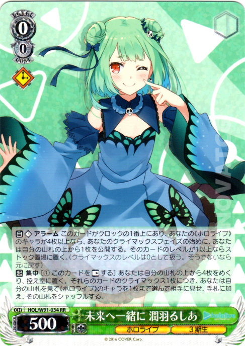 [A] – ALARM If this card is the top card of your Clock, if you have four or more «Hololive»Characters, at the start of your Climax Phase, reveal the top card of your Deck. If that card is Level one or higher, send it to Stock. (Climax is considered Level 0. If not return revealed card to its original position)