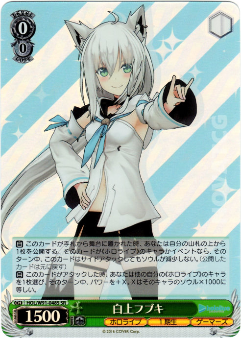 【自】 このカードが手札から舞台に置かれた時、あなたは自分の山札の上から1枚を公開する。そのカードが《ホロライブ》のキャラかイベントなら、そのターン中、このカードはサイドアタックしてもソウルが減少しない。(公開したカードは元に戻す)