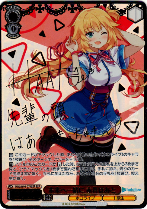 【自】 このカードがアタックした時、あなたは他の自分の《ホロライブ》のキャラを1枚選び、そのターン中、パワーを+1000。