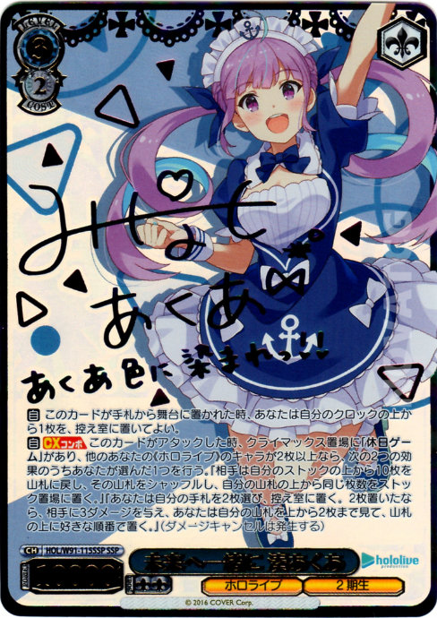 【自】【CXコンボ】 このカードがアタックした時、クライマックス置場に「休日ゲーム」があり、他のあなたの《ホロライブ》のキャラが2枚以上なら、次の2つの効果のうちあなたが選んだ1つを行う。『相手は自分のストックの上から10枚を山札に戻し、その山札をシャッフルし、自分の山札の上から同じ枚数をストック置場に置く。』『あなたは自分の手札を2枚選び、控え室に置く。2枚置いたなら、相手に3ダメージを与え、あなたは自分の山札を上から2枚まで見て、山札の上に好きな順番で置く。』(ダメージキャンセルは発生する)