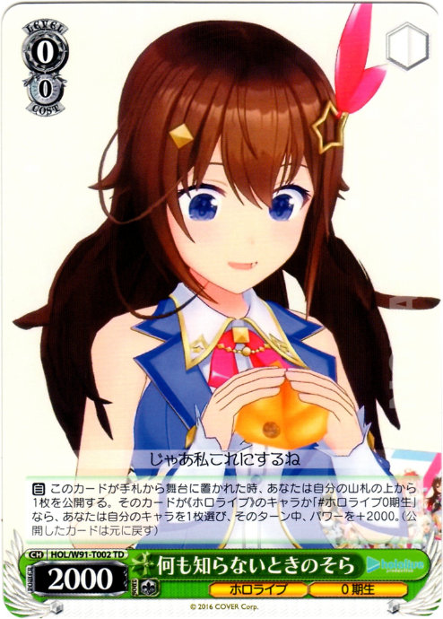 【自】 このカードが手札から舞台に置かれた時、あなたは自分の山札の上から1枚を公開する。そのカードが《ホロライブ》のキャラか「#ホロライブ0期生」なら、あなたは自分のキャラを1枚選び、そのターン中、パワーを+2000。(公開したカードは元に戻す)
