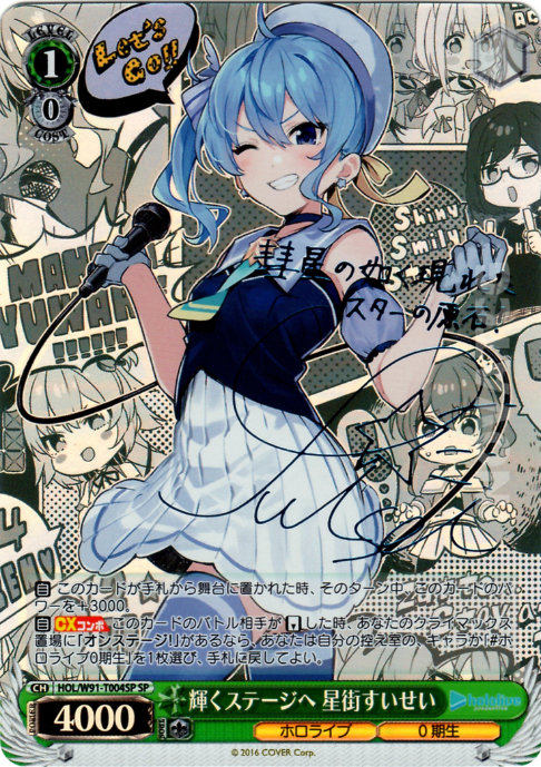 【自】【CXコンボ】 このカードのバトル相手が【リバース】した時、あなたのクライマックス置場に「オンステージ!」があるなら、あなたは自分の控え室の、キャラか「#ホロライブ0期生」を1枚選び、手札に戻してよい。