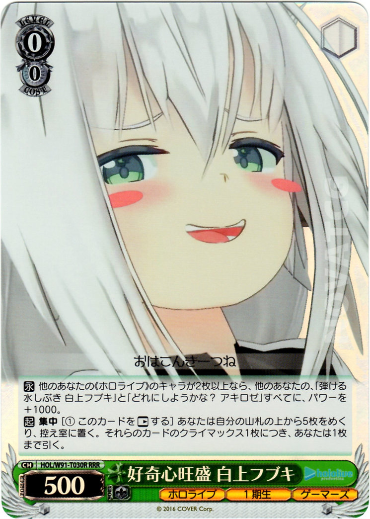 [C] – If you have two or more other «Hololive» Characters, all of your other [弾ける水しぶき 白上フブキ] and [どれにしようかな? アキロゼ] gain +1000 Power.