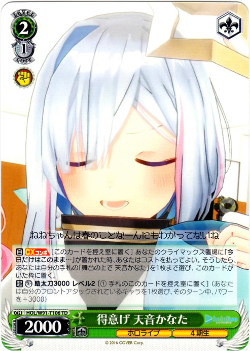 [A] – CX COMBO [Send this card to Waiting Room] When [今日だけはこのまま…] is placed in your Climax Zone, you may pay the cost. If you did, choose one [舞台の上で 天音かなた] in your Hand, place it in this card’s previous slot.