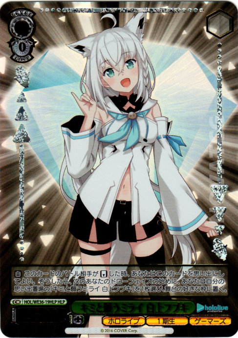 【自】 このカードのバトル相手が【リバース】した時、あなたはこのカードを思い出にしてよい。そうしたら、次のあなたのドローフェイズの始めに、あなたは自分の思い出置場の「キミと願うミライ 白上フブキ」を1枚選び、舞台の好きな枠に置く。