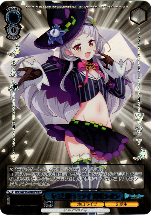 [A] – When this card is placed on Stage from Hand, if you have another [<a href="https://www.novatcg.com/product/HOL-WE36-49/"キミと願うミライ 湊あくあ], choose one of your opponent’s Characters in Front Row, during this turn, that card gets -2000 Power.