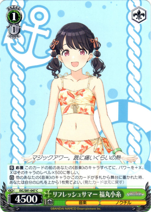 【永】 応援 このカードの前のあなたの《音楽》のキャラすべてに、パワーを+X。Xはそのキャラのレベル×500に等しい。
