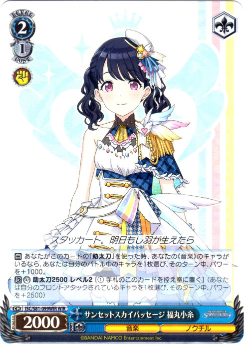 【自】 あなたがこのカードの『助太刀』を使った時、あなたの《音楽》のキャラがいるなら、あなたは自分のバトル中のキャラを1枚選び、そのターン中、パワーを+1000。
