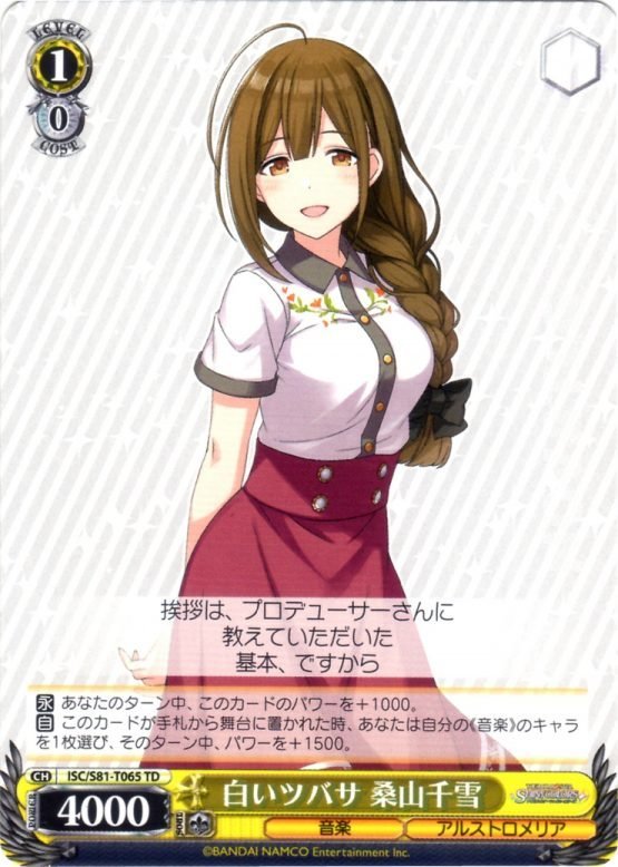 【自】 このカードが手札から舞台に置かれた時、あなたは自分の《音楽》のキャラを1枚選び、そのターン中、パワーを+1500。