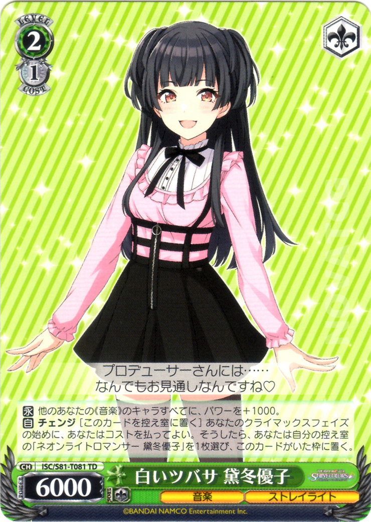 【自】 チェンジ [このカードを控え室に置く] あなたのクライマックスフェイズの始めに、あなたはコストを払ってよい。そうしたら、あなたは自分の控え室の「ネオンライトロマンサー 黛冬優子」を1枚選び、このカードがいた枠に置く。