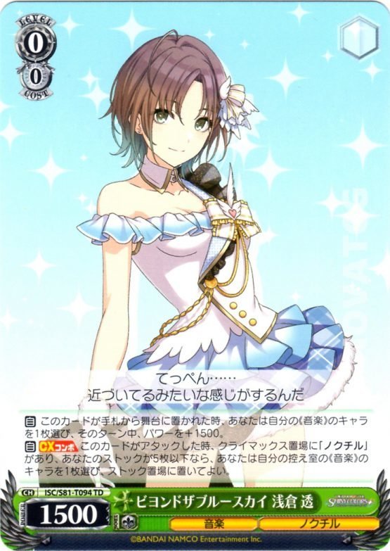 【自】 このカードが手札から舞台に置かれた時、あなたは自分の《音楽》のキャラを1枚選び、そのターン中、パワーを+1500。