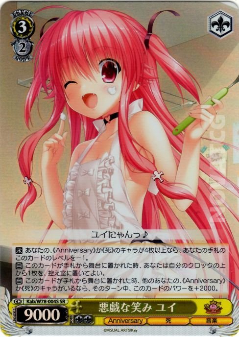 【自】 このカードが手札から舞台に置かれた時、他のあなたの、《Anniversary》か《死》のキャラがいるなら、そのターン中、このカードのパワーを+2000。