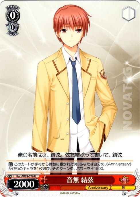 【自】 このカードが手札から舞台に置かれた時、あなたは自分の、《Anniversary》か《死》のキャラを1枚選び、そのターン中、パワーを+1500。