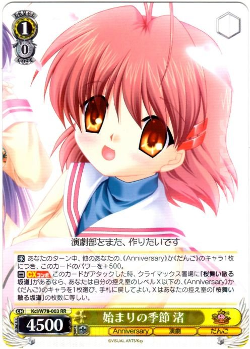 【自】【CXコンボ】 このカードがアタックした時、クライマックス置場に「桜舞い散る坂道」があるなら、あなたは自分の控え室のレベルX以下の、《Anniversary》か《だんご》のキャラを1枚選び、手札に戻してよい。Xはあなたの控え室の「桜舞い散る坂道」の枚数に等しい。