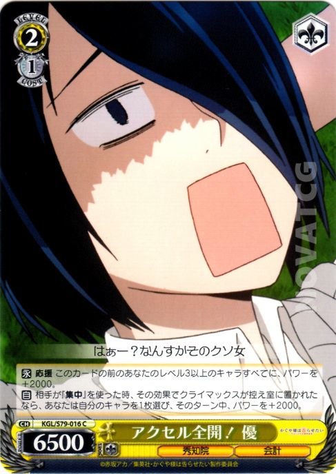 【自】 相手が『集中』を使った時、その効果でクライマックスが控え室に置かれたなら、あなたは自分のキャラを1枚選び、そのターン中、パワーを+2000。