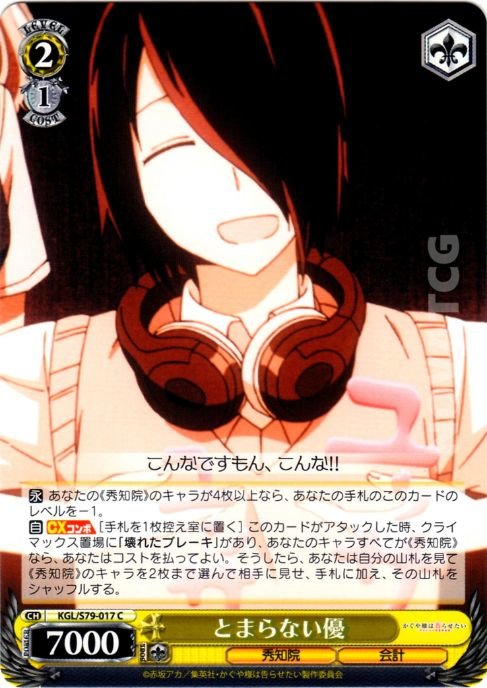 【自】【CXコンボ】[手札を1枚控え室に置く] このカードがアタックした時、クライマックス置場に「壊れたブレーキ」があり、あなたのキャラすべてが《秀知院》なら、あなたはコストを払ってよい。そうしたら、あなたは自分の山札を見て《秀知院》のキャラを2枚まで選んで相手に見せ、手札に加え、その山札をシャッフルする。