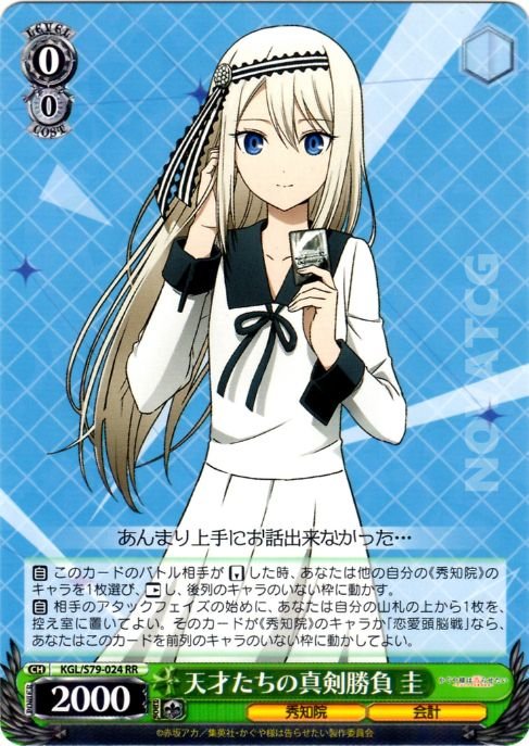 【自】 相手のアタックフェイズの始めに、あなたは自分の山札の上から1枚を、控え室に置いてよい。そのカードが《秀知院》のキャラか「恋愛頭脳戦」なら、あなたはこのカードを前列のキャラのいない枠に動かしてよい。