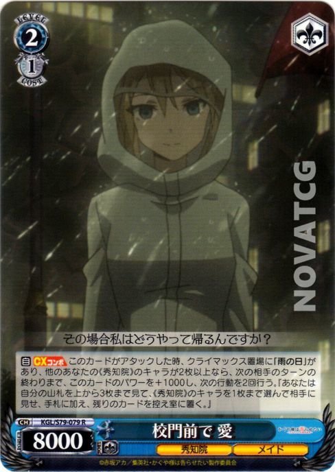 【自】【CXコンボ】 このカードがアタックした時、クライマックス置場に「雨の日」があり、他のあなたの《秀知院》のキャラが2枚以上なら、次の相手のターンの終わりまで、このカードのパワーを+1000し、次の行動を2回行う。『あなたは自分の山札を上から3枚まで見て、《秀知院》のキャラを1枚まで選んで相手に見せ、手札に加え、残りのカードを控え室に置く。』