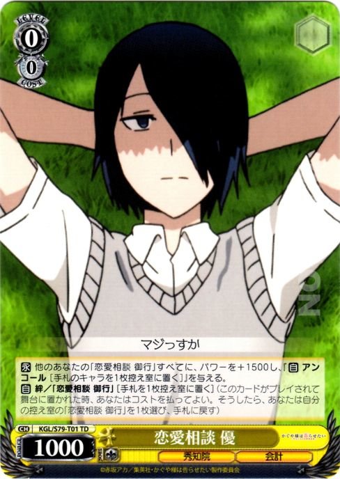【永】 他のあなたの「恋愛相談 御行」すべてに、パワーを+1500し、『【自】 アンコール [手札のキャラを1枚控え室に置く]』を与える。