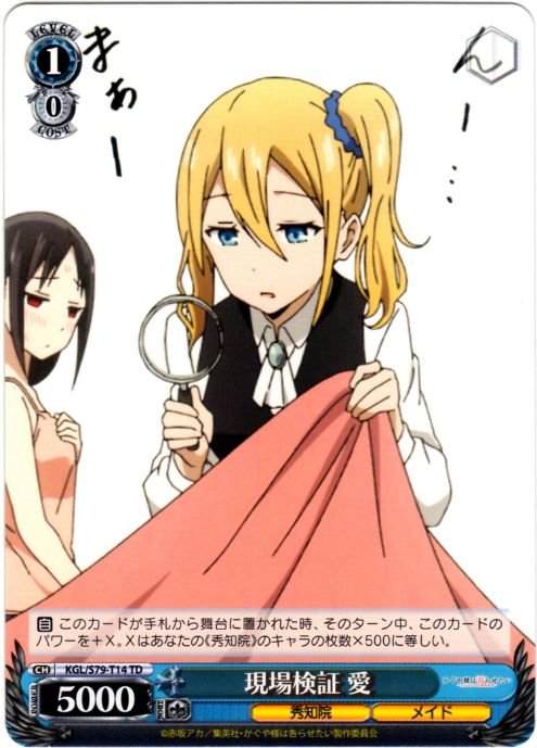 【自】 このカードが手札から舞台に置かれた時、そのターン中、このカードのパワーを+X。Xはあなたの《秀知院》のキャラの枚数×500に等しい。