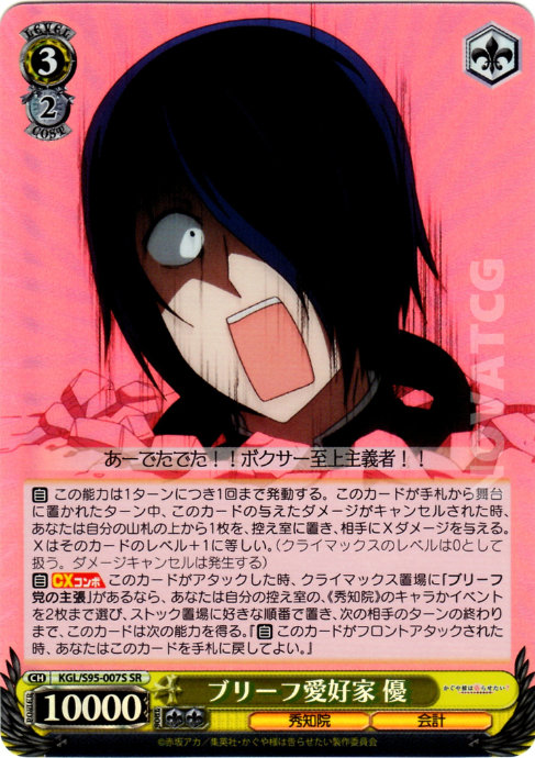 【自】【CXコンボ】 このカードがアタックした時、クライマックス置場に「ブリーフ党の主張」があるなら、あなたは自分の控え室の、《秀知院》のキャラかイベントを2枚まで選び、ストック置場に好きな順番で置き、次の相手のターンの終わりまで、このカードは次の能力を得る。『【自】 このカードがフロントアタックされた時、あなたはこのカードを手札に戻してよい。』
