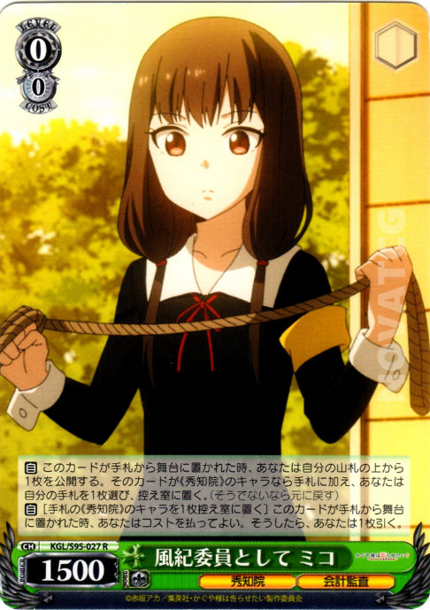 【自】 このカードが手札から舞台に置かれた時、あなたは自分の山札の上から1枚を公開する。そのカードが《秀知院》のキャラなら手札に加え、あなたは自分の手札を1枚選び、控え室に置く。(そうでないなら元に戻す)
