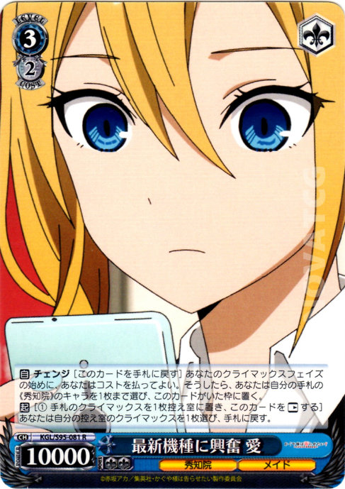 【自】 チェンジ [このカードを手札に戻す] あなたのクライマックスフェイズの始めに、あなたはコストを払ってよい。そうしたら、あなたは自分の手札の《秀知院》のキャラを1枚まで選び、このカードがいた枠に置く。