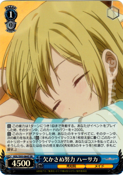 【自】 このカードがアタックした時、あなたのキャラすべてに、そのターン中、次の能力を与える。『【自】[手札のクライマックスを1枚控え室に置く] このカードのトリガーチェックでクライマックスがでた時、あなたはコストを払ってよい。そうしたら、あなたは自分の控え室の《秀知院》のキャラを1枚選び、手札に戻す。』