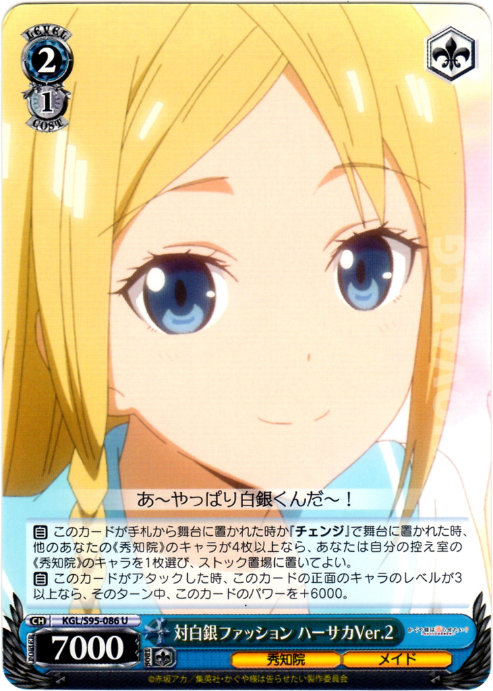 【自】 このカードが手札から舞台に置かれた時か『チェンジ』で舞台に置かれた時、他のあなたの《秀知院》のキャラが4枚以上なら、あなたは自分の控え室の《秀知院》のキャラを1枚選び、ストック置場に置いてよい。