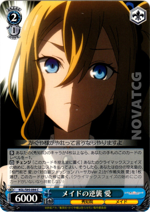 【自】 チェンジ [このカードを控え室に置く] あなたのクライマックスフェイズの始めに、あなたはコストを払ってよい。そうしたら、あなたは自分の控え室の、「校門前で 愛」か「対白銀ファッション ハーサカVer.2」か「作戦失敗 愛」を1枚選び、このカードがいた枠に置く。(クライマックスフェイズの始めにこのカードがいないなら発動しない)