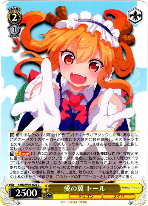 【自】 他のあなたの、《人間》か《ドラゴン》のキャラがアタックした時、あなたはこのカードの下のマーカーの枚数以下の好きな数を宣言し、そのターン中、そのキャラのパワーを+1000し、ソウルを+X。Xはあなたの宣言した数に等しい。(マイナスの数は宣言できない)