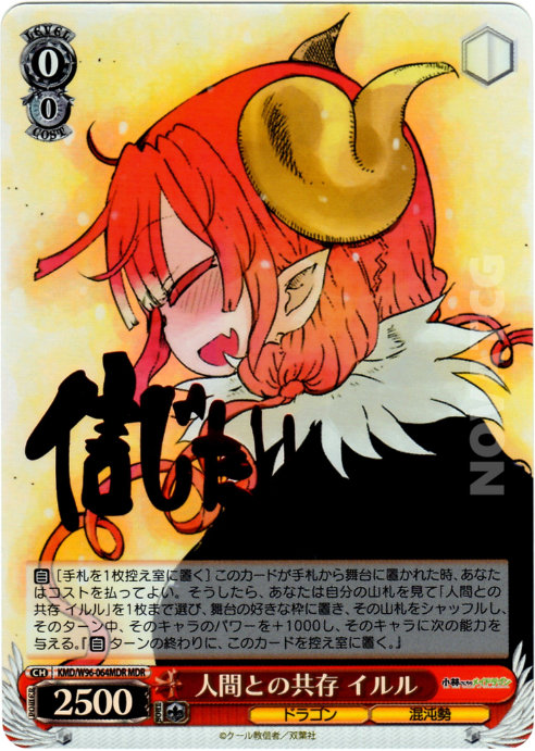 [A] – [Send one card from Hand to Waiting Room] When this card is placed on stage from Hand, you may pay the cost. If you did, search your Deck for one [人間との共存 イルル], place it on Stage in any slot, shuffle your Deck afterwards, during this turn, that Character gains +1000 Power and the following effect: