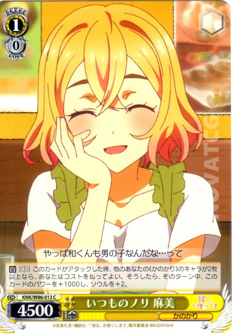 【自】[(1)] このカードがアタックした時、他のあなたの《かのかり》のキャラが2枚以上なら、あなたはコストを払ってよい。そうしたら、そのターン中、このカードのパワーを+1000し、ソウルを+2。