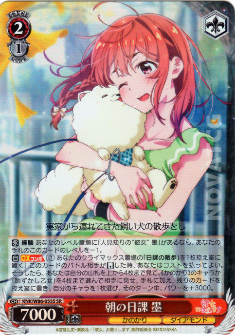 【自】【CXコンボ】[(1) あなたのクライマックス置場の「日課の散歩」を1枚控え室に置く] このカードのバトル相手が【リバース】した時、あなたはコストを払ってよい。そうしたら、あなたは自分の山札を上から4枚まで見て、《かのかり》のキャラか「恥ずかし乙女」を4枚まで選んで相手に見せ、手札に加え、残りのカードを控え室に置き、自分のキャラを1枚選び、そのターン中、パワーを+3000。