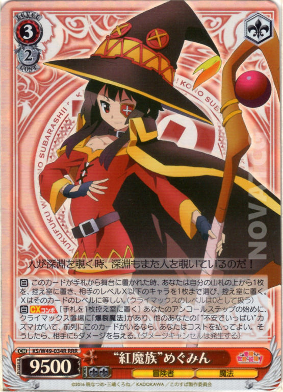 【自】【CXコンボ】[手札を1枚控え室に置く] あなたのアンコールステップの始めに、クライマックス置場に「爆裂魔法」があり、他のあなたの「“不安でいっぱい”カズマ」がいて、前列にこのカードがいるなら、あなたはコストを払ってよい。そうしたら、相手に5ダメージを与える。(ダメージキャンセルは発生する)